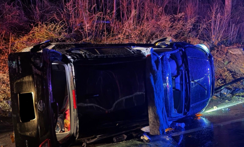 Officials said the driver was not injured but needed assistance exiting the vehicle due to its position. Crews removed the windshield to allow the driver to safely exit and then provided traffic control.