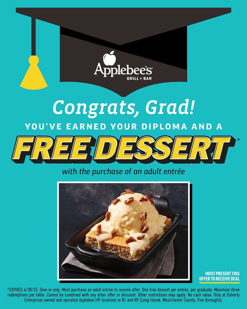 From now through June 30, 2025, Doherty-owned Applebee’s Grill + Bar locations in New Jersey are offering a special promotion to honor recent graduates. Guests must present the picture below at their table to receive one free dessert per adult entrée.
