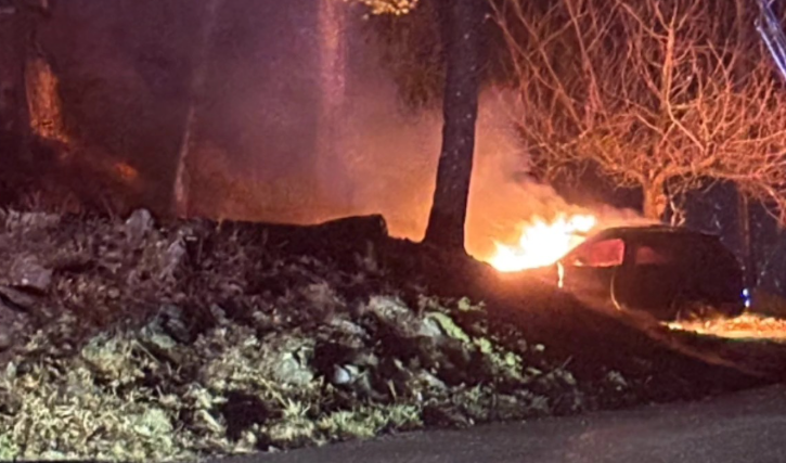 Fire crews were dispatched shortly before 11 p.m. to Alpine Trail for a reported brush fire involving downed wires. Upon arrival, firefighters determined that arcing from the power lines had ignited an unoccupied parked vehicle.