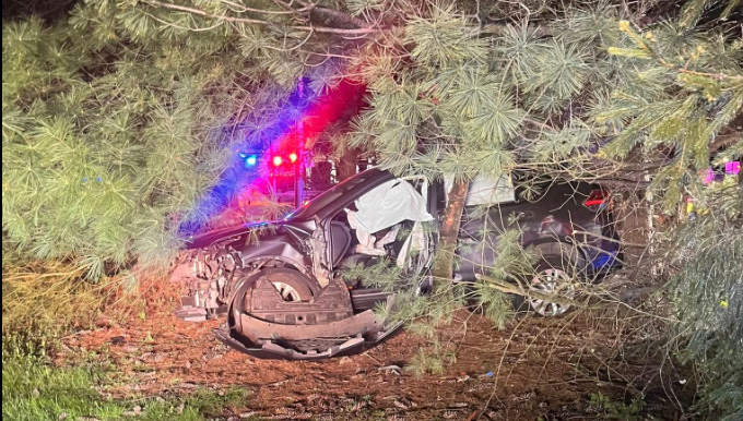 First responders arrived to find one person trapped inside a car that had become pinned against several trees. Emergency medical personnel began assessing the patient from the passenger side while crews worked to gain access to the driver’s side.