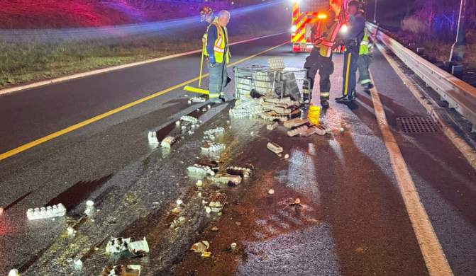 In a lighthearted statement, the department described the situation as an “egg-xact problem,” noting the eggs had “scrambled itself across the roadway” and joking that someone may be “a couple pallets short” at their next delivery.