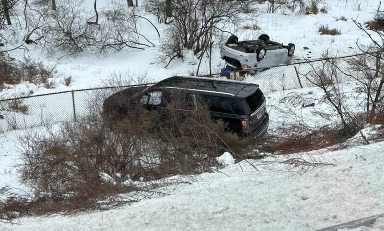 CLINTON TOWNSHIP, N.J. (Hunterdon County) — Clinton Township firefighters and emergency responders conducted a technical rescue Tuesday after two vehicles overturned down a steep, snow-covered embankment along Route 78 eastbound in Clinton Township, officials said.