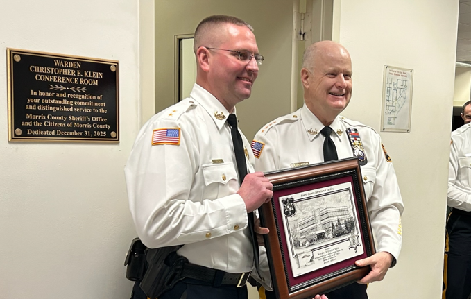 During the ceremony, Klein stood outside the facility’s main conference room as a newly installed plaque was unveiled, officially dedicating the space as the Warden Christopher E. Klein Conference Room as of Dec. 31, 2025. The bronze plaque reads, in part: “In honor and recognition of your outstanding commitment and distinguished service to the Morris County Sheriff’s Office and the Citizens of Morris County.”