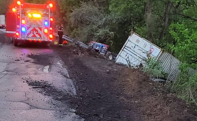 A truck hauling a shipping container left the right shoulder of the highway, ripping out guardrail and ultimately rolling down the embankment.