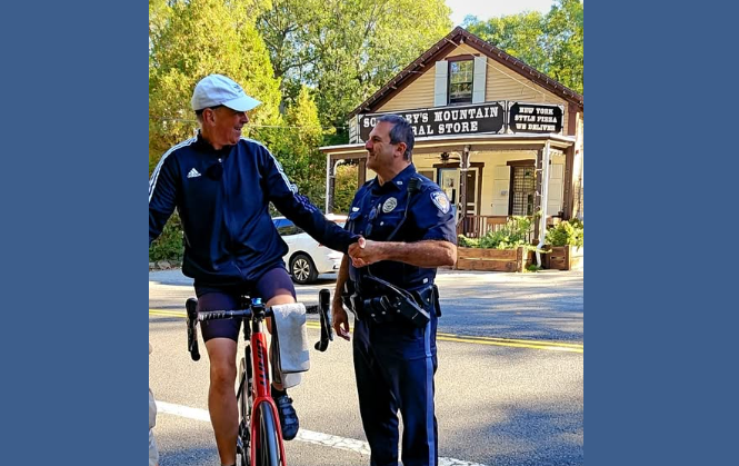 Officer meets cyclist taking history for a spin outside Morris County general store