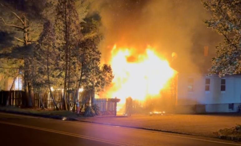 Fire crews were dispatched late Saturday night to a reported house fire and arrived to find a one-story, two-family home with heavy flames visible from one side of the building. Responders also encountered a downed live power line across the roadway, creating an additional hazard at the scene.