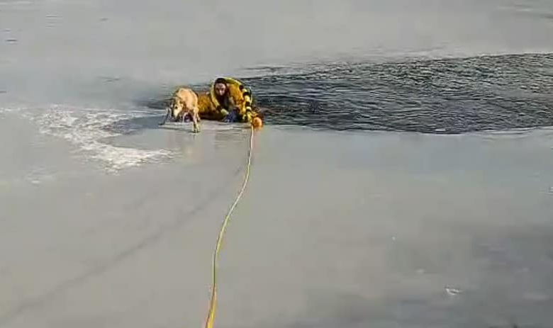 Officials said Poon was able to push the dog back onto the ice and guide it safely to dry land. The dog was not reported to be injured.